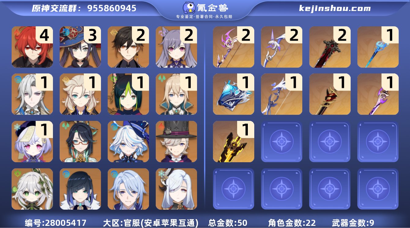 邮箱: 不送邮/死邮 总黄数: 58 冒险等级: 60 金色角色: 闲云,娜维娅,芙宁娜,纳西妲,妮露,夜兰,八重神子,申鹤,珊瑚宫心海,雷电将军,神里绫华,枫原万叶,优菈,胡桃,甘雨,钟离,达达利亚,温迪,提纳里,迪卢克,琴,七七,莫娜 拥有武器: 碧落之珑,波乱月白经津,赤角石溃杵,薙草之稻光,飞雷之弦振,雾切之回光,护摩之杖,和璞鸢,阿莫斯之弓,终末嗟叹之诗,猎人之径,天空之卷,天空之脊,天空之翼,天空之刃,四风原典 亮点: 账号摘要:官服 妹妹号 50黄4命专武雷神 一命专武胡桃 多角色带专武 一 其中 五星角色:胡桃1命、琴2命、温迪0命、枫原万叶0命、钟离 0命、雷电将军4命、莫娜0命、达达利亚0命、珊瑚宫心海0命、七七4命、甘雨0命、申鹤0命、八重神子0命、夜兰0命、妮露0命、纳西妲0命 五星武器,常驻多把 雾切之回光精1、护摩之杖精1×2、薙草之稻光精1、终末嗟叹之诗精1、赤角石溃杵精1、波乱月白经津精2、猎人之径精1可送崩三,崩铁账号