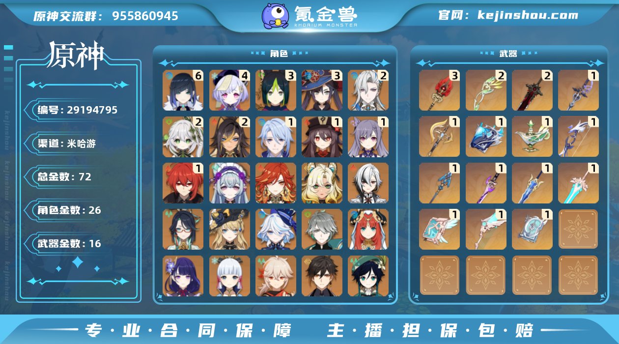 60级/98黄/女主/32个五星角色/28个五星武器 1命阿蕾奇诺,0命闲云,4命芙宁娜,1命那维莱特,0命林尼,1命迪希雅,0命流浪者,2命纳西妲,1命提纳里,1命夜兰,0命神里绫人,0命八重神子,0命荒泷一斗,0命优菈,2命雷电将军,0命枫原万叶,0命神里绫华,0命钟离,1命胡桃,0命甘雨,0命宵宫,0命温迪,0命珊瑚宫心海,0命刻晴,满命七七,4命琴,3命莫娜,5命迪卢克,0命恰斯卡,1命梦见月瑞希,0命爱可菲,0命丝柯克,精1静水流涌之辉,精1万世流涌大典,精1最初的大魔术,精1碧落之珑,精1苇海信标,精1千夜浮梦,精1若水,精2息灾,精1终末嗟叹之诗,精1不灭月华,精1飞雷之弦振,精1雾切之回光,精1苍古自由之誓,精1护摩之杖,精1和璞鸢,精1天空之脊,精1天空之翼,精3阿莫斯之弓,精1天空之刃,精2天空之卷,精1风鹰剑,精1狼的末路,精1天空之傲,精1岩峰巡歌,精2冲浪时光,精1寝正月初晴