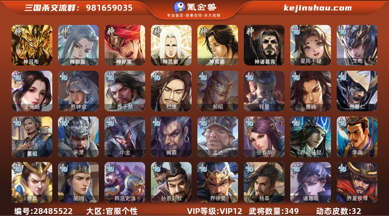 SGS3460 VIP12级 三等大将军 188级 367武将 55史诗武将 451皮肤 43动态皮肤 1910心愿积分 87266雁翎 7715将魂 672元宝 史诗武将:魏吴文鸯,界于禁,界钟会,嵇康,程昱,戏志才,动态杨修,动态曹婴,王元姬,动态清河公主,曹纯,马钧,动态司马师带金皮,星周不疑,诸葛瞻,势魏延,动态谋刘备,动态谋马超,谋赵云,动态蜀吴谋孙尚香带金皮,花鬘,金皮界黄忠,动态张星彩带金皮,关索,金皮沙摩柯,周群,动态势陆郁生,动态谋孙策,骆统,金皮周处,吴景,动态界徐盛带金皮,动态留赞带金皮,金皮谋貂蝉,动态杜预,动态界左慈,沮授,界沮授,张让,麹义,动态刘焉,苏飞,动态徐荣带金皮,兀突骨,庞德公,动态南华老仙,金皮星黄忠,神吕布,动态神赵云,神陆逊,动态神甘宁,金皮神张辽,动态神郭嘉,动态神太史慈,神孙策