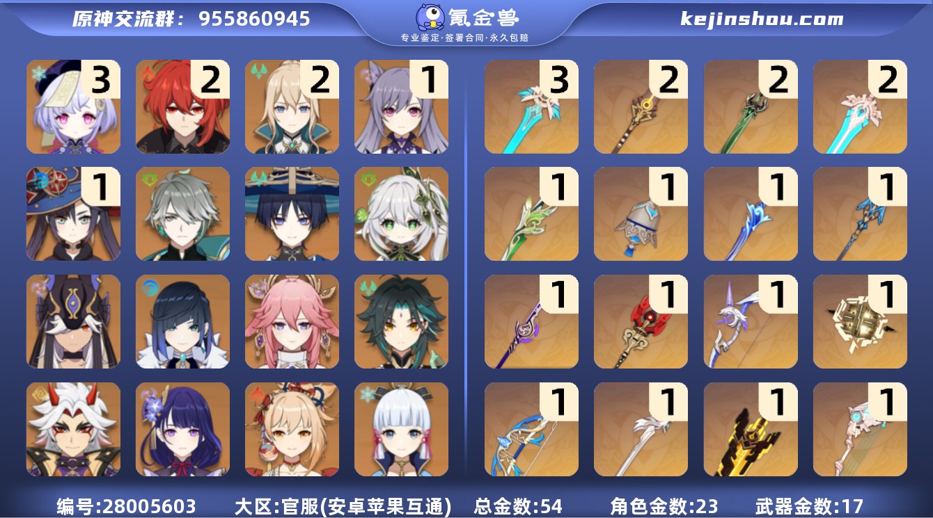 60级/59黄/女主/26个五星角色 2命迪希雅,2命纳西妲,0命妮露,0命提纳里,1命夜兰,0命申鹤,0命荒泷一斗,0命优菈,0命雷电将军,0命枫原万叶,0命神里绫华,0命钟离,2命胡桃,0命甘雨,0命魈,0命温迪,0命可莉,0命达达利亚,0命阿贝多,0命珊瑚宫心海,2命刻晴,1命七七,0命琴,3命莫娜,3命迪卢克,0命玛拉妮,精1圣显之钥,精1若水,精1息灾,精1赤角石溃杵,精1终末嗟叹之诗,精1雾切之回光,精1护摩之杖,精1四风原典,精1天空之脊,精2天空之翼,精1阿莫斯之弓,精1狼的末路,精2天空之傲