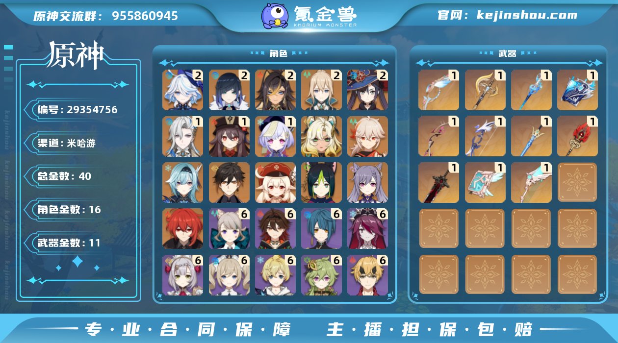 邮箱: 不送邮/死邮 总黄数: 47 冒险等级: 60 3命金色角色: 三命莫娜 2命金色角色: 二命刻晴,二命琴,二命夜兰 1命金色角色: 一命七七,一命胡桃,一命梦见月瑞希 0命金色角色: 迪卢克,温迪,枫原万叶,神里绫华,宵宫,钟离,阿贝多,魈,雷电将军,申鹤,八重神子,赛诺,纳西妲,迪希雅,那维莱特,玛薇卡,茜特菈莉,丝柯克,菲林斯 拥有武器: 狼的末路,飞雷之弦振,天空之卷,天空之刃,护摩之杖,松籁响起之时,若水,苍耀 1精武器: 狼的末路,飞雷之弦振,天空之卷,天空之刃,护摩之杖,松籁响起之时,若水,苍耀