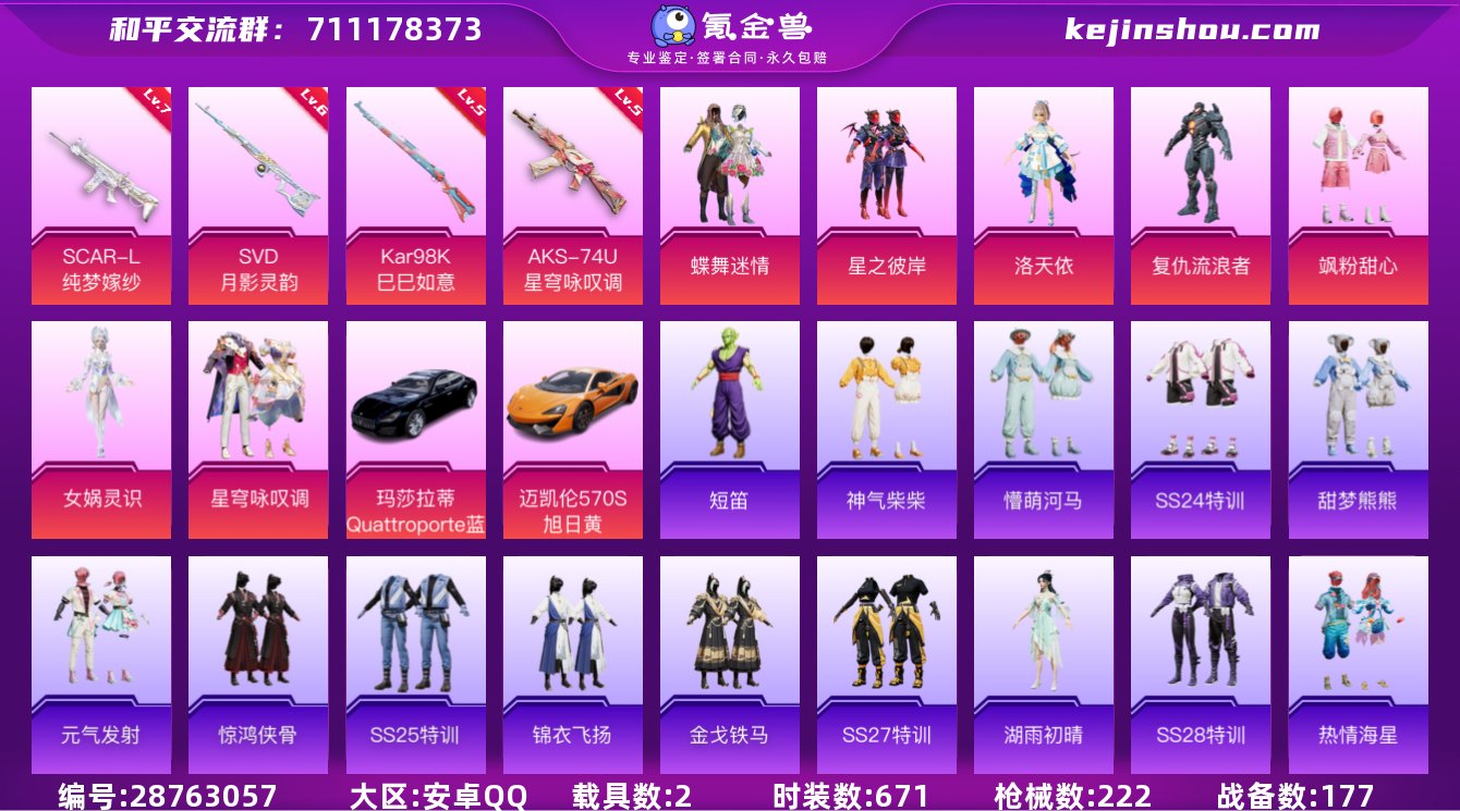热力值:21425 时装数:310 战备数:50 梦幻火箭 五级Kar98K-巳巳如意,一级DP-28-豹影疾电 梦幻火箭飞行器,环太平洋降落伞,梦幻火箭降落伞 薄荷星砂,SS34特训套装,冰冻风暴,缤纷果语,白色伏地魔,长空猛禽,蝶变,大橘大利,大橘为重,都市猎人,都市魅力,粉恋花,鹤鸣,黑色伏地魔,黄色名流,黄色运动,红色运动,幻影武者,橘黑制服,娇憨猪猪,竞技达人朋克,竞技名士,吉莉礼服,极速红龙,狂沙舞者,空投萌叽,蓝冰羽,蓝彩潮人,猎鹰,浪漫天命,蓝色运动,恋语绒绒,冷焰舞者,猎影月神,漫步者,猛禽,魅力单车,萌趣咩咩,霓虹极客,霓虹街区,牛气满满,暖心熊熊,破蛋小黄鸡,破晓战魂,绮丽涂鸦,青年教官,瑞龙福将,SS17特训,SS18特训,SS19特训,SS20特训,SS21特训,SS26特训,SS27特训,SS29特训,SS31特训套装,SS32特训套装,SS33特训套装,巳巳如意,特训学院,团圆交子,特战英豪,完美偶像,小丑鱼,香桃花海,星途旅人,异彩先驱,耀粉歌者,鹰眼刺客,战地督导,智谋强哥,紫幽梦 AKM-彩虹符号,AKM-虎虎生威,AKM-破晓战魂,AKM-影袭,AKS-74U-粉粉喵呜,AMR-鬼刀,AUG-耀粉歌者,DBS-第五大道,GROZA-异彩先驱,GROZA-影袭,Kar98K-梦幻火箭,Kar98K-影袭,M200-乌木金纹,M249-无面战甲,M24-影袭,M416-动感兔斯基,M762-彩虹符号,M762-瑞龙福将,M762-天降萌叽,MG3-瑞龙福将,蜜獾-垂柳戏鸭,蜜獾-天降萌叽,蜜獾-娇憨猪猪,Mini14-穿刺龙虾,Mini14-梦幻火箭,Mini14-炫彩节奏,Mini14-香桃花海,Mini14-异彩先驱,Mk14-紫幽梦,MK20-H-星途旅人,MP5K-异彩先驱,P90-巳巳如意,P92-紫幽梦,平底锅-娇憨猪猪,平底锅-瑞龙福将,平底锅-异彩先驱,平底锅-紫幽梦,PKM-紫幽梦,破片手榴弹-巳巳如意,破片手榴弹-星途旅人,R45-幻彩电音,S12K-垂柳戏鸭,S12K-娇憨猪猪,S12K-龙宫之主,S12K-瑞龙福将,S1897-糯团青竹,S1897-炫彩节奏,S1897-紫幽梦,S686-巳巳如意,SCAR-L-黄金龙骨,SCAR-L-炫彩节奏,SCAR-L-星途旅人,SLR-娇憨猪猪,汤姆逊-天降萌叽,汤姆逊-炫彩节奏,汤姆逊-异彩先驱,UZI-娇憨猪猪,UZI-影袭,VSS-香桃花海,Win94-瑞龙福将 都市猎人降落伞,娇憨猪猪降落伞,瑞龙福将降落伞,异彩先驱降落伞,紫幽梦降落伞 实名:不可修改 卖家说:都市猎人梦幻火箭极品号