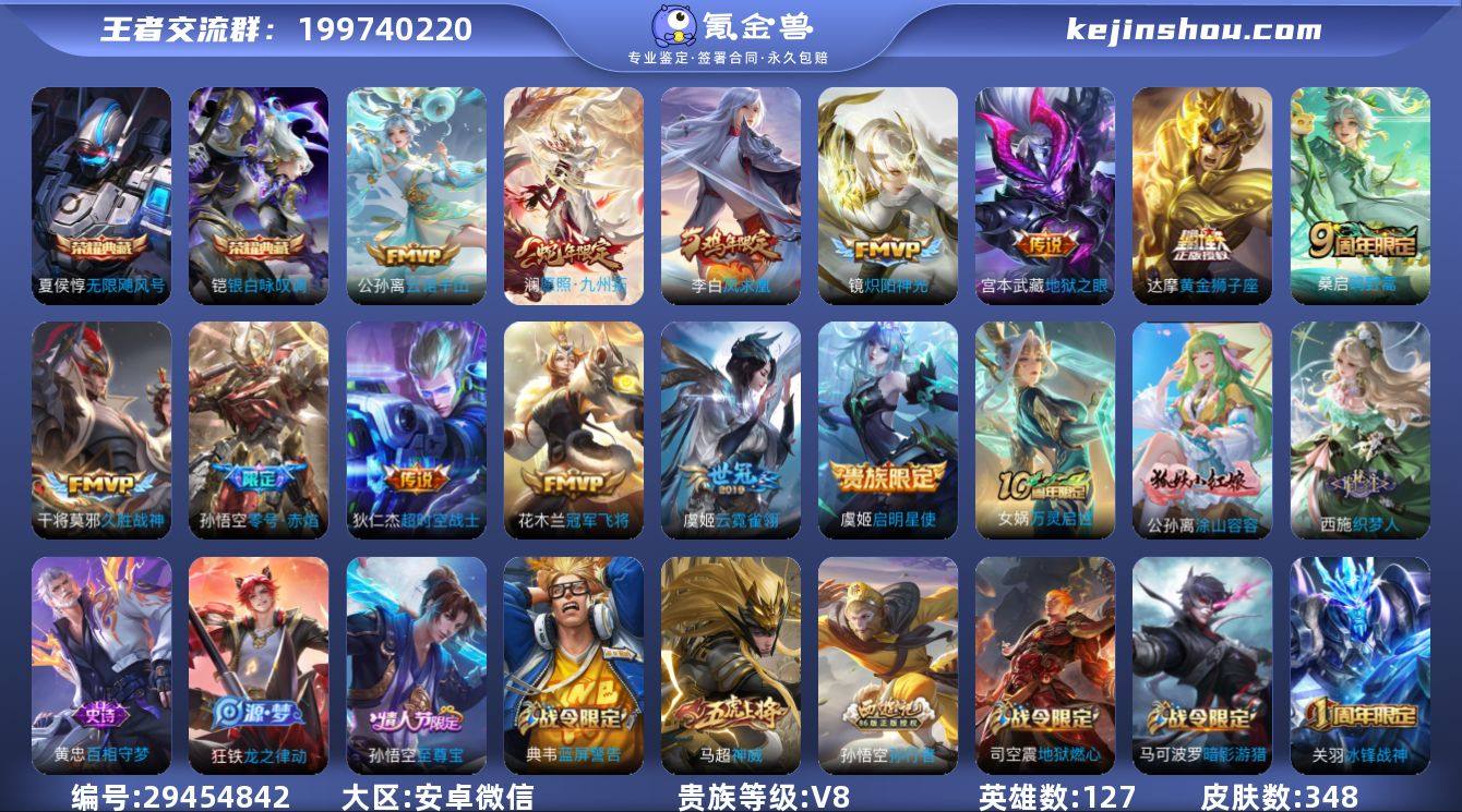 V8 2典藏 1珍品 29传说 1星元 291皮肤 125英雄 【2水晶】韩信-弑枪猎影,伽罗-最初的交响【1珍品传说】孙策-时之奇旅【29传说】李白-诗剑行,狄仁杰-神器·狴犴令,马超-无双飞将,孙策-挚爱之约,达摩-黄金狮子座,狄仁杰-超时空战士,干将莫邪-久胜战神,关羽-武圣,镜-炽阳神光,李信-一念神魔,梦奇-胖达荣荣,曜-李逍遥,虞姬-启明星使,张良-黄金白羊座,诸葛亮-武陵仙君,吕布-怒海麟威,公孙离-记忆之芯,夏洛特-浮生妄,孙尚香-乘龙·问璇玑,孙策-乘龙·淬吴钩,曜-云鹰飞将,桑启-鸣野蒿,云缨-幻光神枪,妲己-愿照·众生和,司空震-愿照·山河定,蔡文姬-愿照·福禄聚,虞姬-愿照·岁时盈,澜-愿照·九州拓,女娲-愿照·千秋盛【1星元】狄仁杰-星际治安官【88史诗】墨子-降魔,元歌-无心,鬼谷子-五谷丰年,赵云-未来纪元,钟无艳-超时空战士,狂铁-电玩高手,貂蝉-唤灵魅影,澜-赏金猎手,明世隐-吟游魔法,阿轲-暗夜猫娘,阿轲-节奏热浪,安琪拉-心灵骇客,白起-星夜王子,百里守约-特工魅影,百里玄策-原初追逐者,曹操-幽灵船长,嫦娥-拒霜思,程咬金-功夫厨神,妲己-女仆咖啡,妲己-魅力维加斯,狄仁杰-魔术师,狄仁杰-鹰眼统帅,典韦-岱宗,貂蝉-圣诞恋歌,伽罗-箭羽风息,干将莫邪-真爱魔法,宫本武藏-鬼剑武藏,韩信-飞衡,韩信-傲雪梅枪,后羿-如梦令,花木兰-水晶猎龙者,花木兰-青春决赛季,黄忠-火炮绅士,镜-匿光追影者,铠-曙光守护者,铠-青龙志,兰陵王-暗隐猎兽者,李元芳-逐浪之夏,廉颇-地狱岩魂,刘邦-德古拉伯爵,刘禅-绅士熊喵,刘禅-天才门将,露娜-紫霞仙子,吕布-末日机甲,蒙犽-狂想玩偶喵,墨子-金属风暴,芈月-白晶晶,哪吒-雪上飞焰,上官婉儿-梁祝,裴擒虎-李小龙,沈梦溪-月团寄思,司马懿-暗渊魔法,孙策-猫狗日记,孙尚香-水果甜心,孙尚香-蔷薇恋人,孙悟空-孙行者,王昭君-偶像歌手,夏侯惇-乘风破浪,小乔-青蛇,雅典娜-冰冠公主,亚瑟-心灵战警,杨戬-天秀·启明,嬴政-...