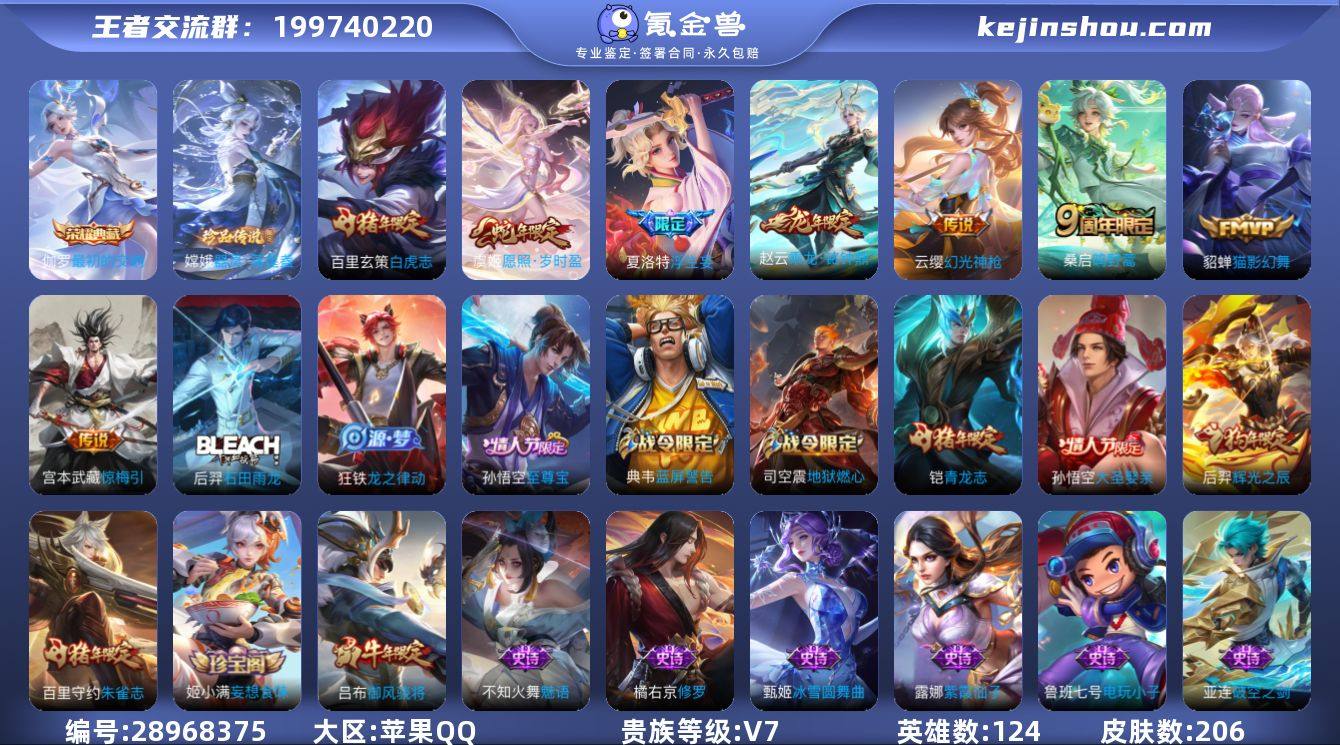 124英雄-154皮肤-安卓QQ 可二次 v7/至尊星耀/无双飞将 马超,云鹰飞将 曜,浮生妄 夏洛特,炽阳神光 镜,怒海麟威 /154皮肤/124英雄/0典藏/0珍品无双/0无双/1珍品传说/13传说/46史诗/8稀有英雄 【1 珍品传说】时之奇旅 孙策, 【13 传说皮肤】无双飞将 马超,云鹰飞将 曜,浮生妄 夏洛特,炽阳神光 镜,怒海麟威 吕布,黄金狮子座 达摩,末日机甲 孙策,一念神魔 李信,战鼓燎原 典韦,淬星耀世 赵云,幻光神枪 云缨,祥瑞亨通 裴擒虎,鸣野蒿 桑启, 【46 史诗皮肤】末日机甲 吕布,超元猎域 百里玄策,紫霞仙子 露娜,百解令 蒙犽,天秀·启明 杨戬,妄想食味 姬小满,德古拉伯爵 刘邦,山海·玄木吟 马可波罗,心灵战警 亚瑟,五谷丰年 鬼谷子,无心 元歌,鬼剑武藏 宫本武藏,星夜王子 白起,摇滚巨星 嬴政,百相守梦 关羽,修罗 橘右京,魅力维加斯 妲己,黄金分割率 诸葛亮,赏金猎手 澜,星界游侠 暃,晚萤 娜可露露,鹰眼统帅 狄仁杰,大圣娶亲 孙悟空,玫瑰异探 镜,孙行者 孙悟空,金属风暴 墨子,傲雪梅枪 韩信,特工魅影 百里守约,猫狗日记 孙策,驭风魔法 戈娅,魔术师 狄仁杰,皇家上将 赵云,水晶猎龙者 花木兰,破空之剑 亚连,圣诞狂欢 吕布,圣诞老人 老夫子,永昼 夏洛特,冰雪圆舞曲 甄姬,青蛇 小乔,千年之狐 李白,曙光守护者 铠,青龙志 铠,水果甜心 孙尚香,幽灵船长 曹操,乘风破浪 夏侯惇,暗隐猎兽者 兰陵王, 【66 勇者皮肤】时空谍影 海诺,玲珑珍味 西施,大漠名商 沈梦溪,缤纷绘卷 张良,龙舞盛年 沈梦溪,乐园追猎者 白起,功夫炙烤 廉颇,海盐诗旅 桑启,汉昭烈帝 刘备,白色死神 白起,黑桃队长 鲁班七号,黄金武士 典韦,阴阳师 狄仁杰,次元突破 哪吒,古海寻踪 张良,牛运亨通 牛魔,功夫老勺 老夫子,海滩派对 项羽,哥特玫瑰 露娜,无双福将 程咬金,潮玩探月行 猪八戒,天穹祈灯 鬼谷子,决胜大满贯 曹操,五福同心 张飞,次元傲视 杨戬,幻乐之宴 鬼谷子,东方不败...