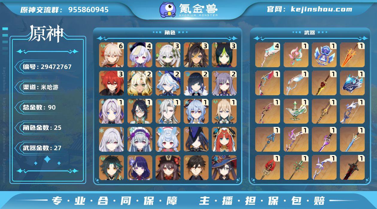 账号概括: 角色 1命:魈140元、刻晴30元 0命:雷神80元、万叶70元、甘雨80元、凌华80元、七七10元、莫娜10元、迪卢克10元 武器: UP:精一总价值40元 总结: 1.12黄,9个金色英雄,1个金色武器,角色无满命,1个1命的魈的加分还可以;武器这边数量很少且无满精,无常驻武器 2.练度这一块甘雨若水攻击低了,双爆还可以;雷神渔获攻击和暴击低了一点点,爆伤是可以的;凌华天目攻击是可以的,双爆低了;魈和刻晴没养;万叶铁蜂刺精通和充满都低了 3.推荐组队:雷神+九条+万叶+班尼特;魈+托马+雷主+早柚 因为角色练度问题且是B服的账号可以给到一个550元的市场价