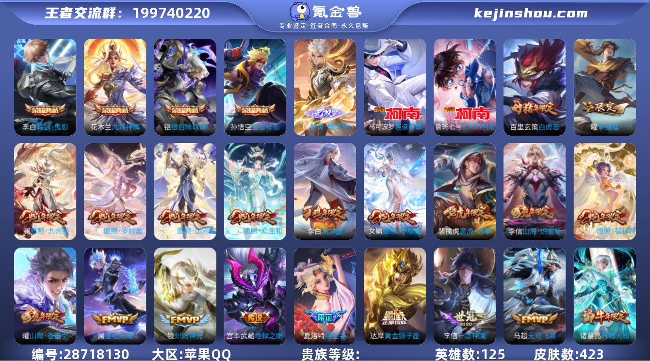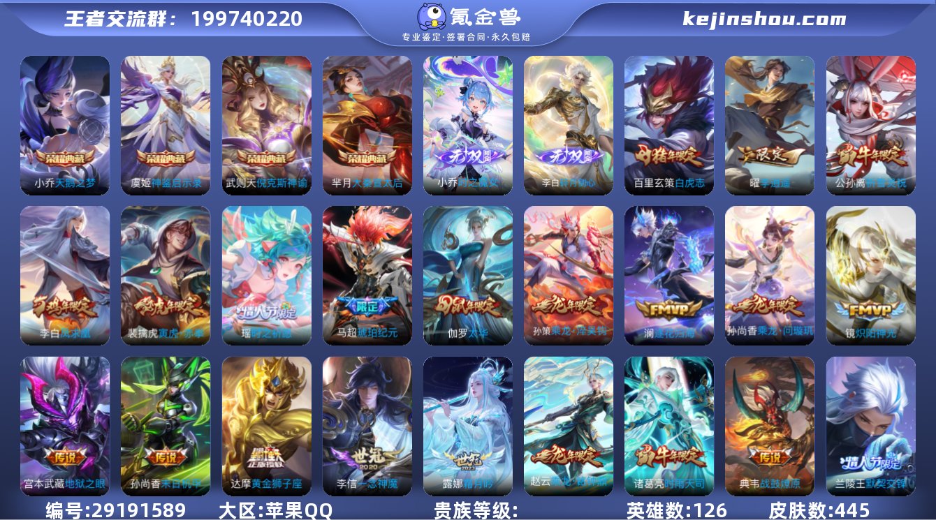 贵族等级:V10 典藏皮肤数:2 珍品无双皮肤数:1 无双皮肤数:2 珍品传说皮肤数:3 传说皮肤数:49 史诗皮肤数:144 皮肤数:461 英雄数:126 段位:王者 卖家说:国服貂蝉 小国婉儿